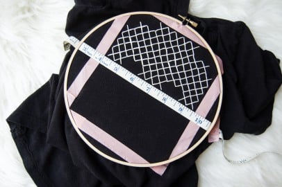 Step 8: Pay close attention to the spots that need to be skipped, and you’ll be done before you know it! When your design is finished, tie it off on the inside of the shirt, trim the excess thread, then remove your hoop and grid!