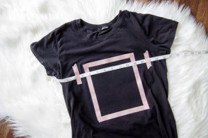 Step 3: Turn the shirt right-side out again and measure a rectangle of washi tape onto the shirt so that the inside of it is the exact size your finished design will be. My skull is 5 ½” wide by 6 ½” tall, so the inside edges of my tape marked that space out. Make sure that the entire open area inside the box lies within the area covered by interfacing.
