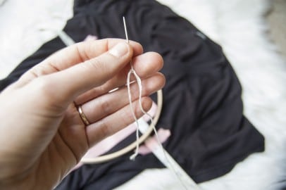 Step 6: Cut a length of embroidery floss, then loop one end through the needle as pictured and knot the other end. You don’t need to separate the individual threads of floss since we want the image to be bold enough that it stands out on the shirt.