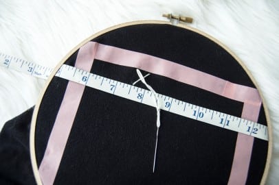 - Invisible grid method — Place your sewing tape measure down on the shirt, leaving the exact height of your cross-stitching squares above the line (for me, it’s ½”, so you can see I’ve created an invisible row that is ½” tall). Make sure the tape measure lines up with the right and left sides of the taped off box so you can easily visualize the width of each stitch. Use tape and the embroidery hoop to hold everything in place and stitch your Xs in place accordingly. As you complete each row, you’ll have to take the embroidery hoop off and move the measuring tape down to create space for the next row.