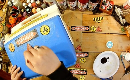 4. Once your cooler is fully labeled, it’s time to paint! Choose a few grungy colors to add some dirt, grime and spatter to your surface. Have fun with your options, a few gross details don’t hurt! Fingerprints, mold, slime, smears, drips… it’s all fair game.